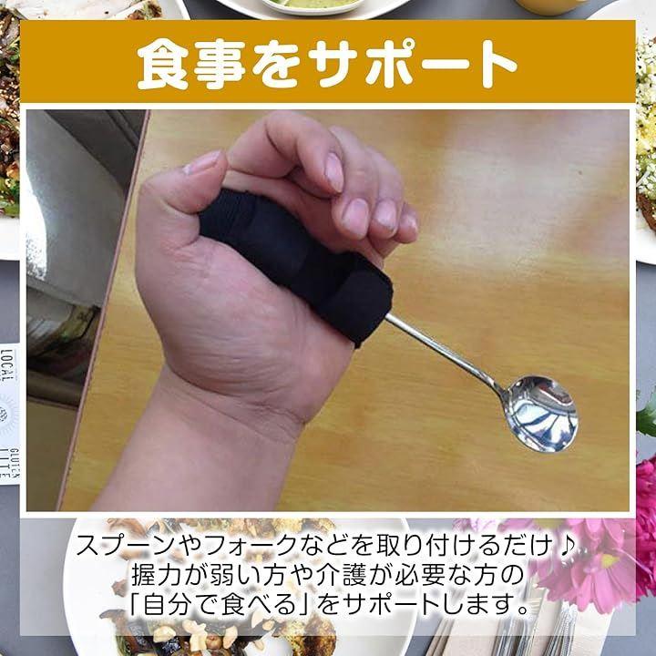 「使い方簡単」スプーンやフォーク、歯ブラシ、ペンなど持ちたいものをテープで固定し、手に取り付けるだけ。調節可能ストラップで、手にしっかりフィット。通気性が良く、柔らかな触り心地です。