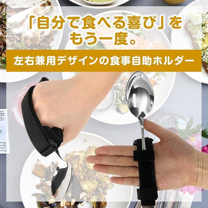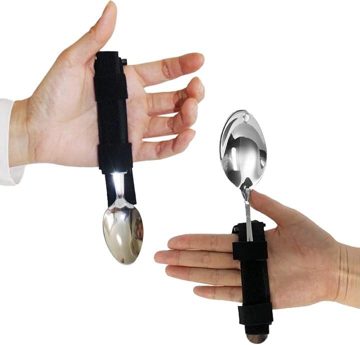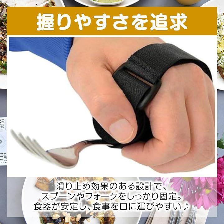 「使い方簡単」スプーンやフォーク、歯ブラシ、ペンなど持ちたいものをテープで固定し、手に取り付けるだけ。調節可能ストラップで、手にしっかりフィット。通気性が良く、柔らかな触り心地です。