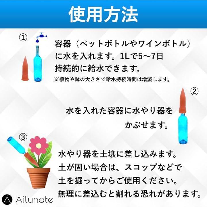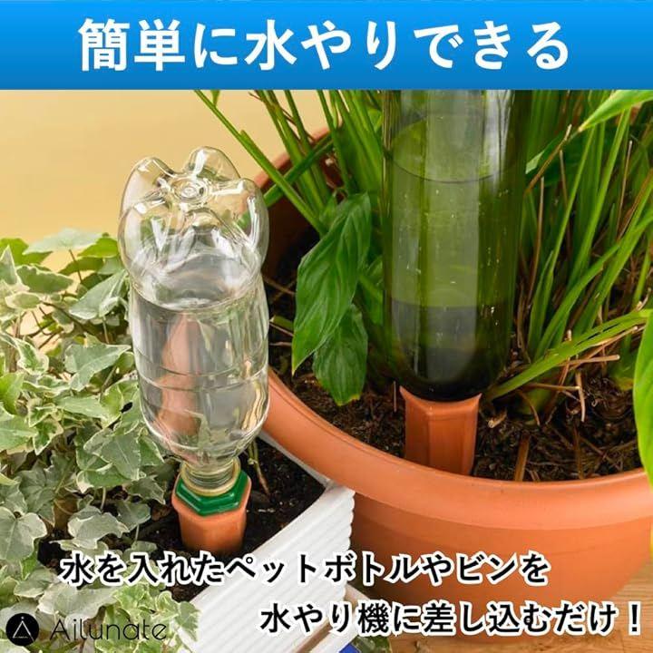 「簡単に水やりができる」ペットボトルやワインボトルなどに水を入れて陶器に差し込むだけで、簡単に自動水やりができます。
