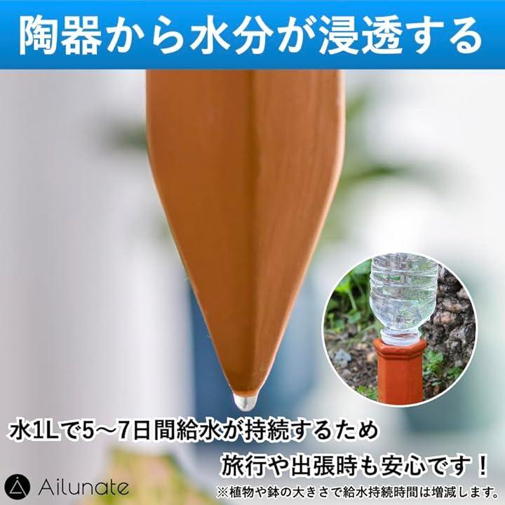 「陶器から水分が浸透する」水1Lで5~7日間給水が持続するため、旅行や出張など留守中に水やりができます。