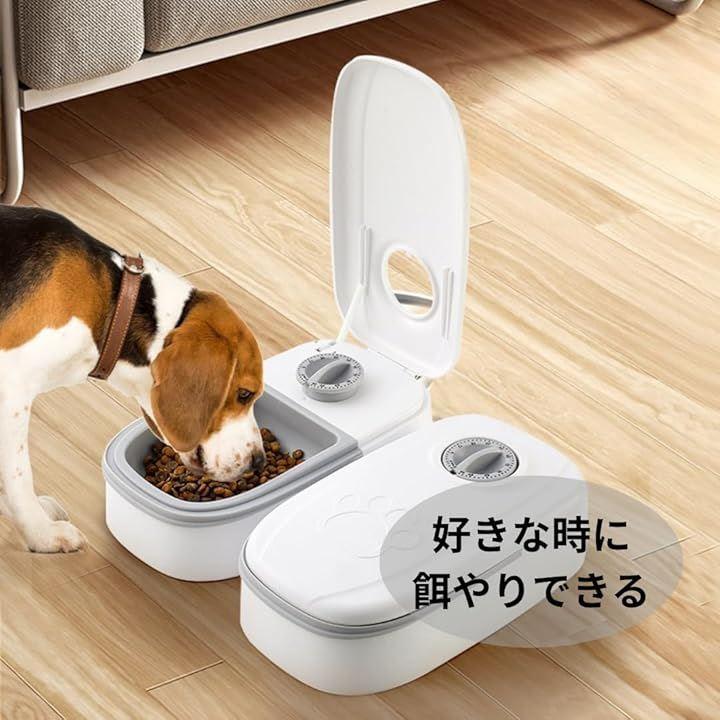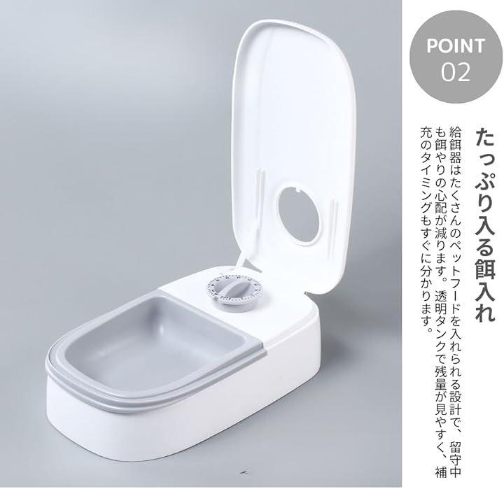 「たっぷり入る餌入れ」給餌器はたくさんのペットフードを入れられる設計で、留守中も餌やりの心配が減ります。