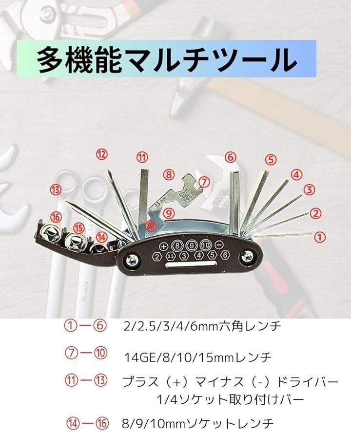 マルチツールは2/2.5/3/4/5/6mm六角棒レンチ、14GE/8/10/15mm六角ボルトレンチ、プラス(+)ドライバー、マイナス(-)ドライバー、ソケット取付バー、8/9/10mmソケットレンチ。