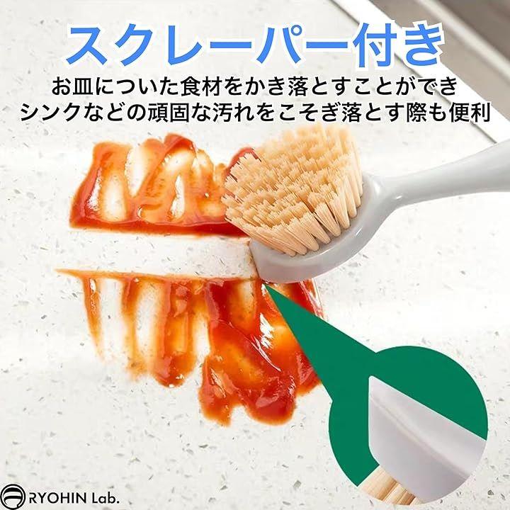 「スクレーパー付き」ブラシの反対側にスクレーパーが付いている設計で、お皿についた食材をかき落とすことができ、シンクなどの頑固な汚れをこそぎ落とす際に便利です。