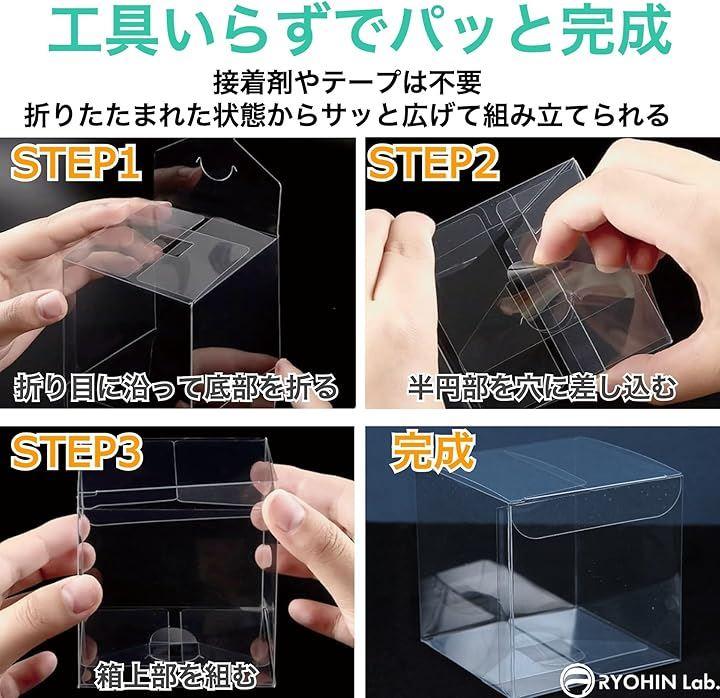 「中身が映える透明デザイン」中に入れたものがそのまま見えるクリア素材で、ラッピングや展示にぴったりな組み立て型の透明ボックスです。