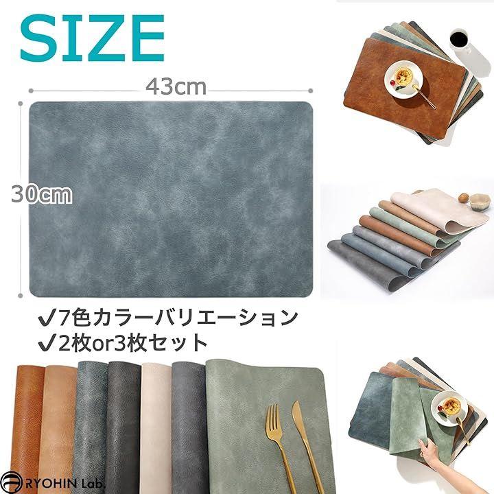「商品内容」数量バリエーション:ランチョンマット2枚セット・ランチョンマット3枚セット、サイズ:約43cmx30cmx0.2cm、カラーバリエーション:7種類(ダークブラウン・ブルー・グレー・ブラック・ピンク・ライトブラウン・グリーン)、重量:145g/枚、素材:PUレザー、耐熱温度:上限100℃