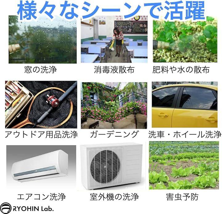 「様々なシーンで活躍」 窓の洗浄、消毒液散布や農薬・肥料の散布、ガーデニング・家庭菜園・観葉植物などの水やり、車・ホイールの洗浄、アウトドア用品・工具の洗浄、エアコン・室外機の洗浄などで活躍できます。