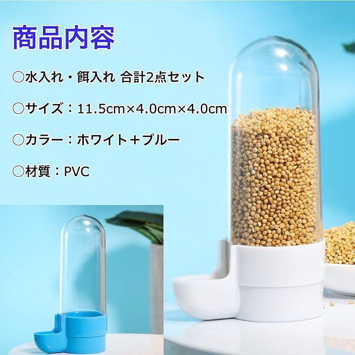 「商品仕様」セット内容:水入れ・餌入れ 合計2点セット、サイズ(約):本体部12x4cm・給餌部3x1.5cm、カラー:ホワイト+ブルー、材質:PVC *モニターの環境等により、色の見え方に若干差が生じる場合がございます。