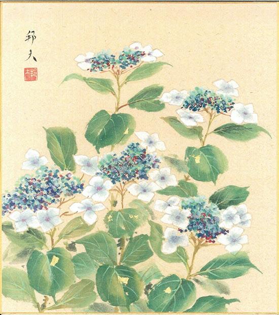 作品名: 額紫陽花 作者: 片山邦夫 サイズ: W24.2xH27.12cm 材質: 和紙 収納: 紙袋 産地: 日本 用途: 夏掛け |