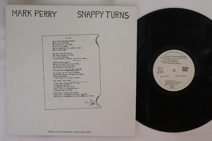 ・アーティストMark Perry・タイトルSnappy Turns・レーベル・型番DEPTFORD FUN CITY DLP06・フォーマットLPレコード・コンディション(盤)良い (VG+)・コンディション(ジャケット)可 (VG)・コンディション(帯)オビなし・特記事項【カバー汚れ】