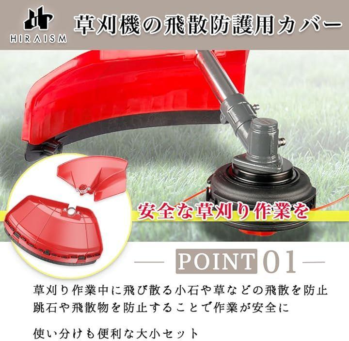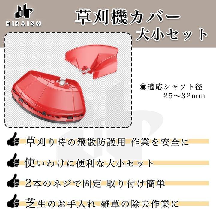 「セット内容」草刈り機カバー 大小2個セット カラー:レッド <小サイズ> 長さ:27.8cm 幅:19.5cm 重さ:約150g <大サイズ> 長さ:38cm 幅:21.5cm 重さ:約250g 適用シャフト径:25mm~32mm 素材:プラスチック