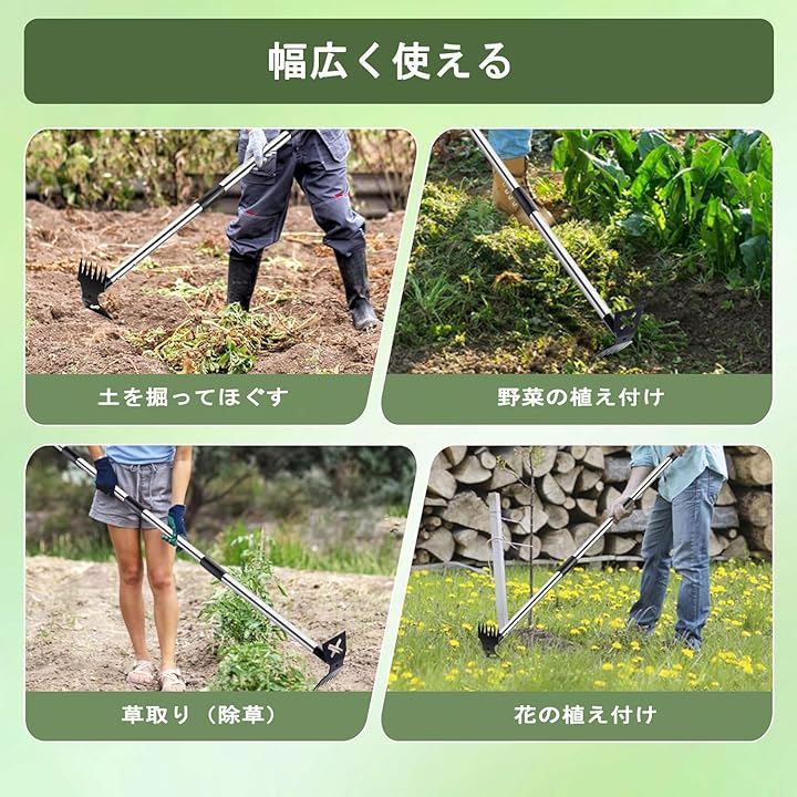 (4)「様々な作業に対応」 草取り、草むしり、雑草抜きはもちろん、土の耕しや小面積の整地、鍬としての使用も可能。