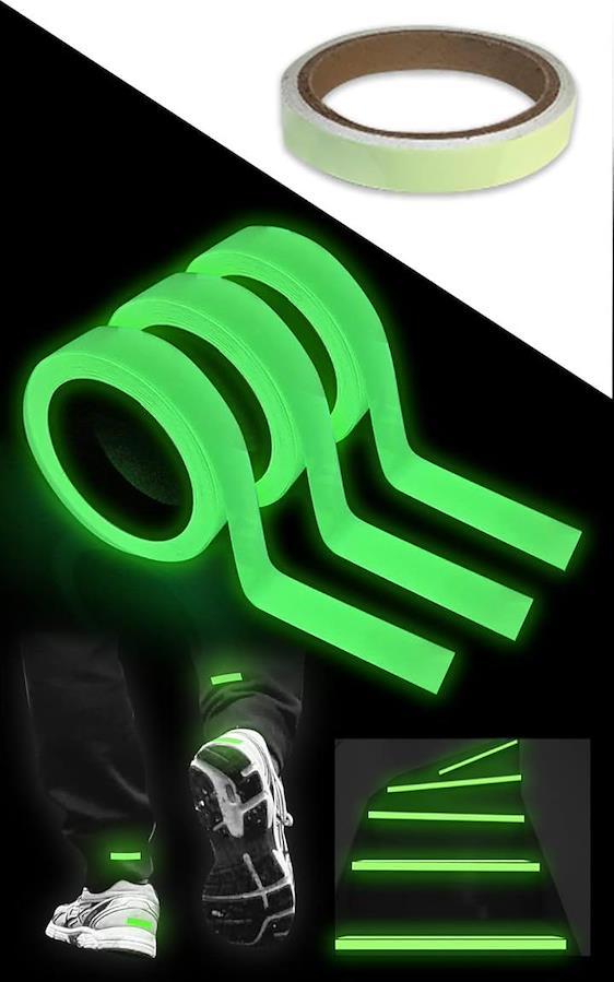 暗闇でしっかり発光する蓄光テープ。 光を吸収してグリーン・ブルー・オレンジに発光し、夜間の安全対策に便利です。