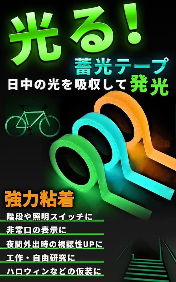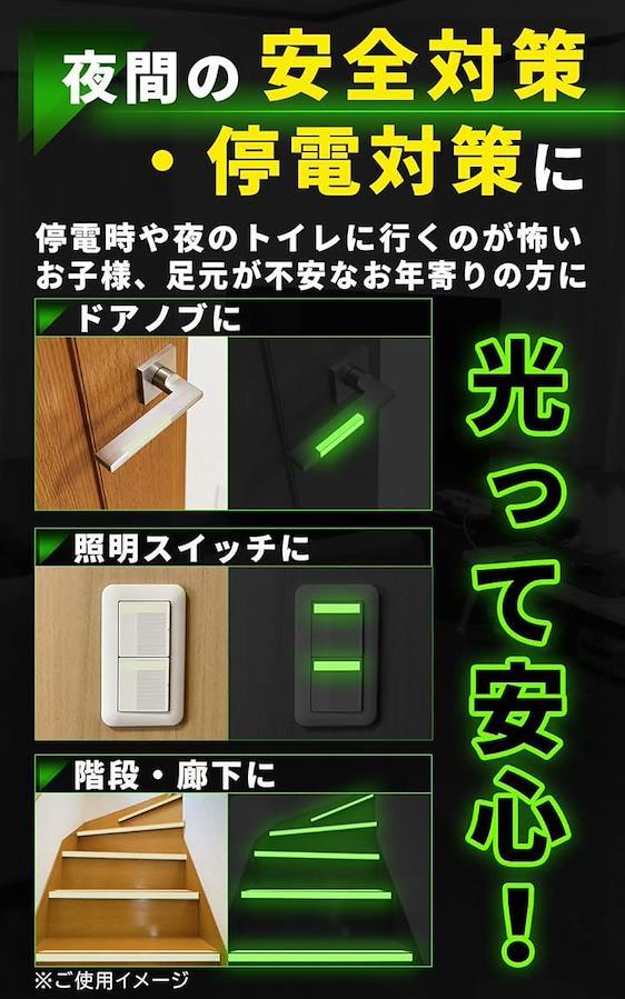「光る。蓄光テープ」日中の光を吸収して発光。夜間の階段や照明スイッチに。