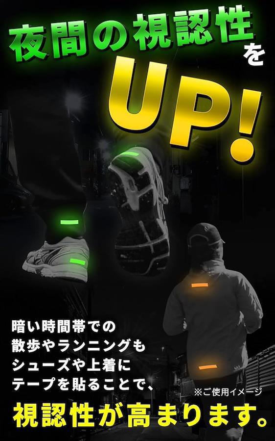 「夜間の外出時の視認性をUP」暗い時間帯での散歩やランニングも、シューズや上着にテープを貼ることで、車など周囲への視認性が高まり安全です。