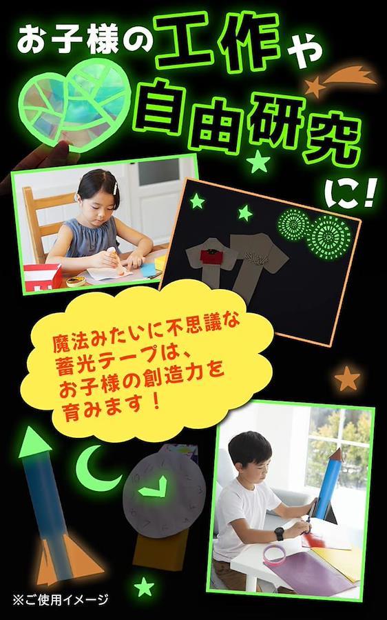 「お子様の工作・自由研究に。」魔法みたいに不思議な蓄光テープは、お子様の創造力を育みます。光る花火の切り絵。夜に光るステンドグラス。光るロケット。さあ、君は何を作る?