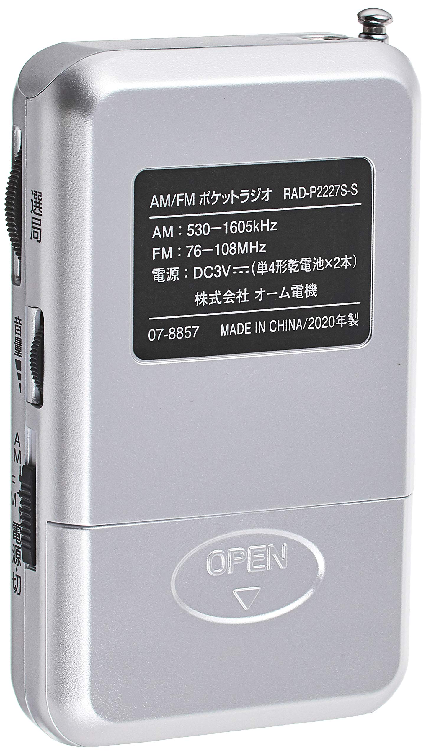 3営業日以内に発送≪新品未開封品≫:(薄型・軽量・イヤホン付属) AM/FM/ワイドFM対応 ポケットラジオ オーム電機 RAD-P2227S-S(シルバー)ブランド オーム(OHM)色 シルバー特徴 乾電池対応チューナー採用技術 FM, AM電源 バッテリー式対応無線周波数 FM, AM付属コンポーネント owner's manual, earphone商品の重量 0.07 キログラムハードウェアインターフェイス 3.5ミリオーディオ周波数 108 MHzAM/FMポケットラジオ(ワイドFM対応! …76~108MHz)選局かんたん! 光る同調ランプ付高感度! クリアな音声で聴ける電池持続時間…約145時間 ※FM受信、イヤホン使用時スピーカー搭載・イヤホン付属仕 様受信周波数:AM 530~1605 kHzFM 76~108 MHz電源:DC3V 単4形乾電池×2本(別売)電池持続時間:スピーカー使用時AM受信 約60時間、FM受信 約58時間イヤホン使用時AM受信 約150時間、FM受信 約145時間(アルカリ乾電池使用、音量中