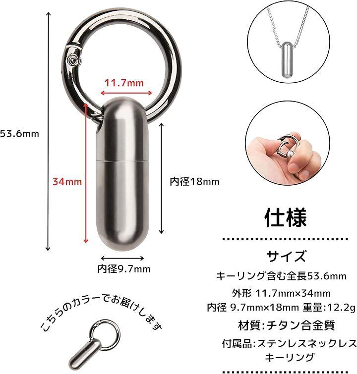 「仕様」サイズ:キーリング含む全長53.6mm、外形11.7mmx34mm、内径 9.7mmx18mm、重量:12.2g、材質:チタン合金、付属品:ステンレスネックレス、キーリング