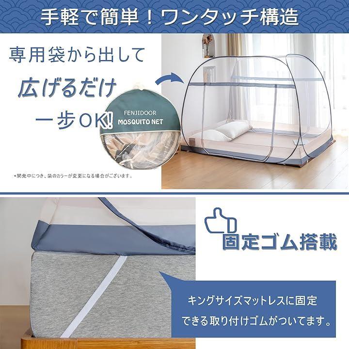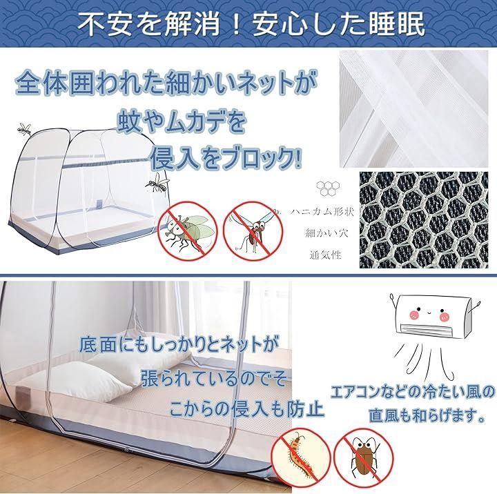 「ワンタッチ式」ワンタッチ式なので3つステップで蚊帳を広げることができて、面倒な組み立てがなくてとても便利です。