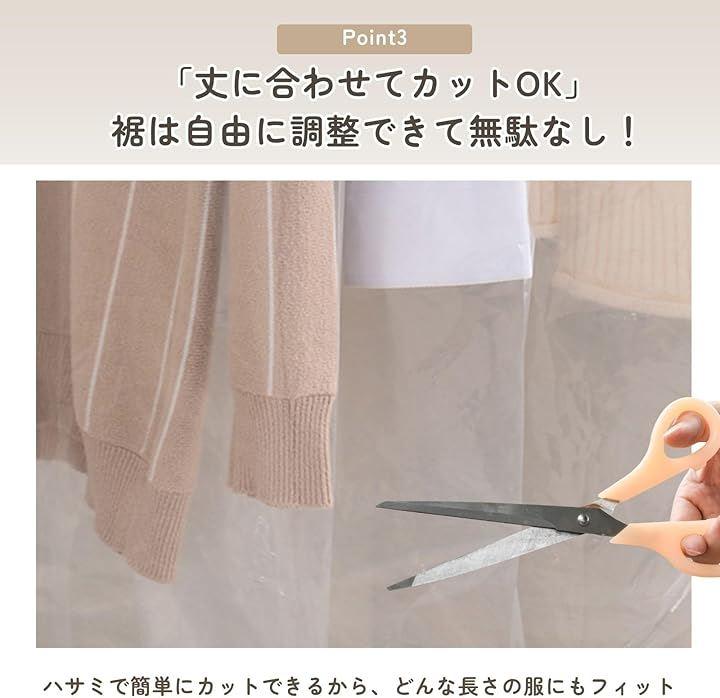 衣装カバーは裾カットOKで自由に調整:ハサミでカットできる仕様だから、丈の短い衣類にも対応可能。