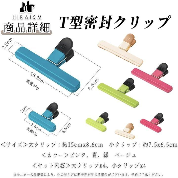「商品内容」T型密封クリップ <サイズ>大クリップ:約15.3cmx8.6cm 小クリップ:約7.8x6.5cm <カラー> 紫、青、緑 ベージュ <セット内容>大クリップx4、小クリップx4 *モニターの環境等により、色の見え方に若干差が生じる場合がございます。