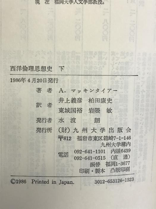 西洋倫理思想史 (下) 九州大学出版会 A. マッキンタイアー 井上義彦 他訳