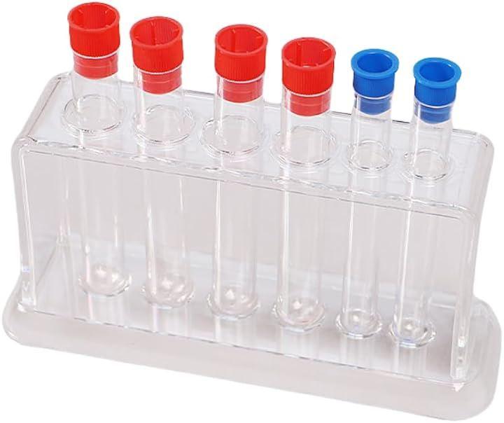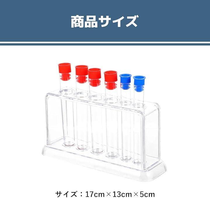 「商品詳細」サイズ:17cmx13cmx5cm、重量:80g、材質:プラスチック、梱包内容:試験管立て・試験管6本(フタつき)