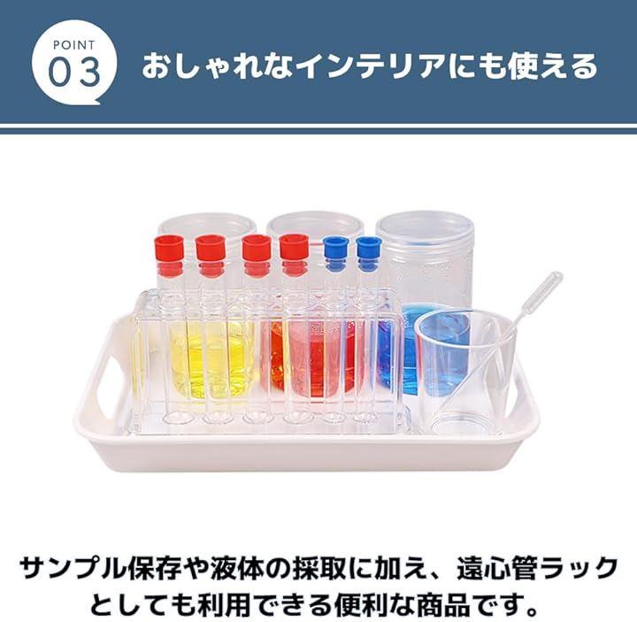 「おしゃれなインテリアにも使える」このアイテムは、実験や化学の学習に最適で、サンプル保存や液体の採取に加え、遠心管ラックとしても利用できる便利な商品です。