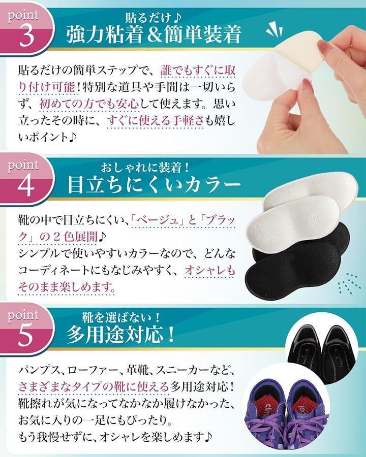 姿勢が整い歩き方もラクに、長時間履いても疲れにくい、足ズレ防止で靴の中が安定、クッション性でかかとを優しくサポート