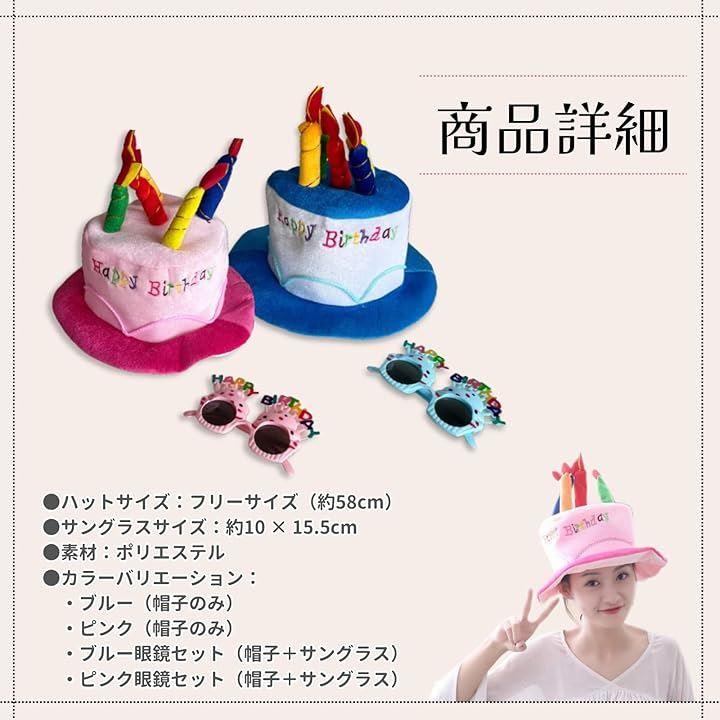 「商品詳細」 *ハットサイズ:フリーサイズ(約58cm) *サングラスサイズ:約10 x 15.5cm *素材:ポリエステル *カラーバリエーション:ブルー(帽子のみ)/ ピンク(帽子のみ)/ ブルー眼鏡セット(帽子+サングラス)/ ピンク眼鏡セット(帽子+サングラス)
