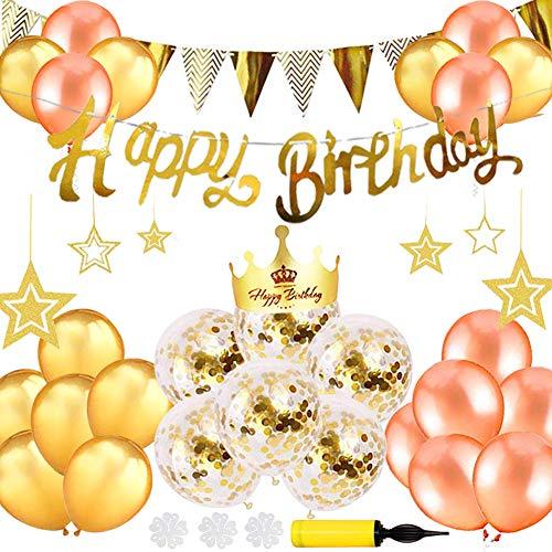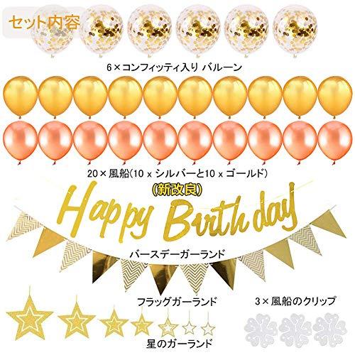 【多数セット】6個コンフィッティ入りバルーン、誕生日の帽子、空気入れ、 風船(ゴールド)×10 、風船(ローズゴールド) ×10 、1Xバースデーガーランド、1X星のガーランド、1個フラッグガーランド 、3個風船のクリップ。 【適用場合】誕生日パーティー、特別な祝日、普段お部屋の飾り、インテリア、お店の飾りなどにも適用。室内はもちろん、お庭や野外でのパーティー?イベントでもご利用頂けます;パーティーの会場を装飾でき。 【華麗な感じ】光沢があるペーパー製、角度により光が反射し高級感があります。キラキラとしていてゴージャスな雰囲気を演出できます。 【素材】光沢があるペーパー製、角度により光が反射し高級感があります。 【デザイン】このゴールド調で豪華感がある飾りセットは男の子にも女の子にもぴったりします。鮮やかな色で人目を引きやすいし、喜びの雰囲気を盛り上げることができます。ご使用中、問題がありましたら、お気軽にアマゾンのメールで連絡してください。24時間内に返事いたします。