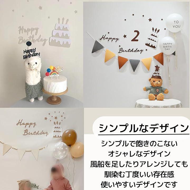 「仕様」サイズ:Happy Birthday 約7.5x56.5cm(1列に並べた場合) ケーキ:約24x14cm スター:約2.5~4.cm 数字:約15cm 素材:フェルト カラー:コーヒー/ブルー/レッド