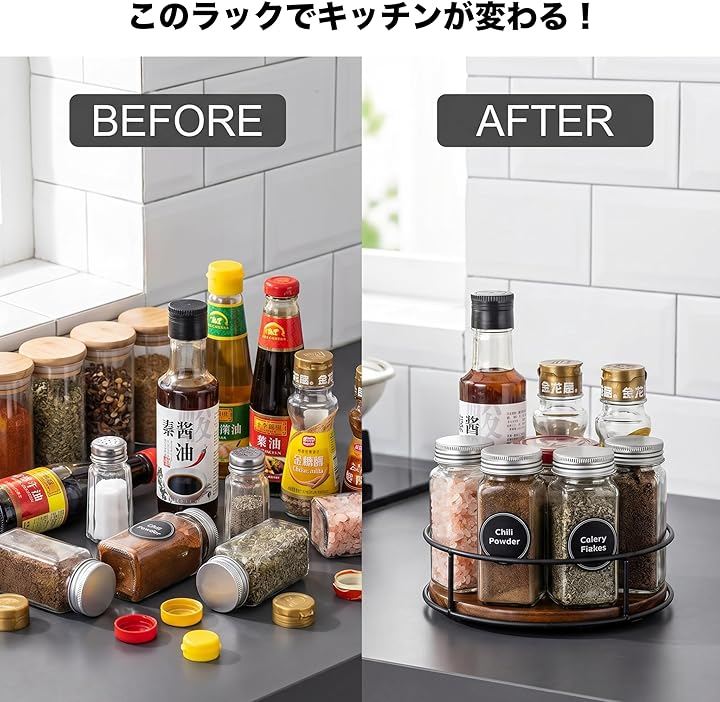 省スペースで調味料や小瓶をすっきり収納でき、回転式なので取り出しもスムーズ。