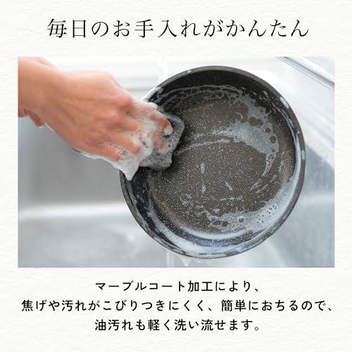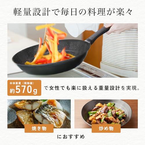 軽くてラクラク、しかも本格派。使いやすさにトコトンこだわったフライパンシリーズです。 特長アルミ鋼材の底面を厚く、サイド面を薄く加工するスピン製法を採用することで、熱効率を高めています。 特長ハンドルの長さを短くし、重量バランスを工夫することで『重さを感じにくい』構造に設計しています。 サイズ:長さ270×幅422×高さ82mm ※取っ手含む 鍋高さ:約55mm 鍋幅:約268mm 重量:570g 生産国:中国 素材・材質:表面加工 内面=ふっ素樹脂塗膜加工、外面=耐熱焼付け塗装、本体=アルミニウム合金(底の厚さ2.2mm)、貼り底=ステンレススチール(底の厚さ:2.2mm)、取付金具=アルミニウム合金、取っ手=フェノール樹脂(耐熱温度150℃)、ハンドルキャップ:ナイロン(耐熱温度200℃) 対応熱源:ガス火・IH対応 ※こちらのフライパンはPFOA、およびPFOSを使用しておりません。