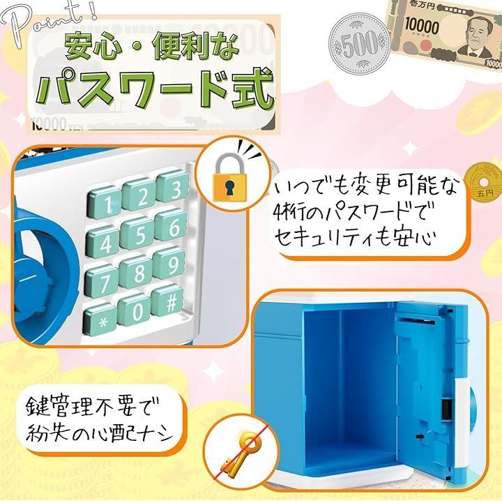 「パスワード式」4桁のパスワードでセキュリティがしっかりしているので、子供のお小遣い管理や、金銭教育にも最適です。