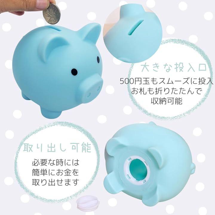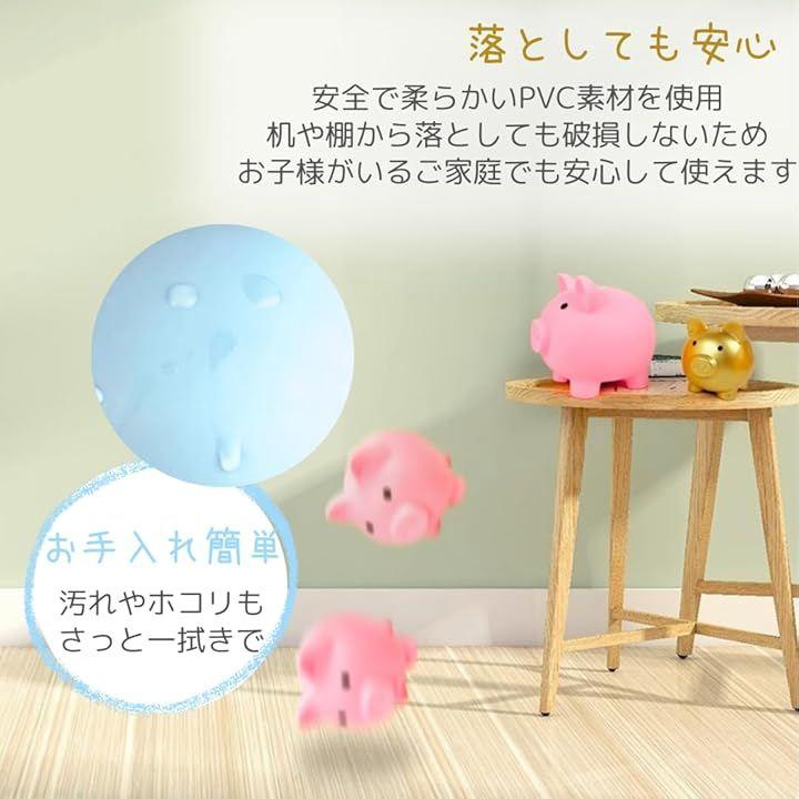 「落としても安心、やわらかPVC製」安全で柔らかいPVC素材を使用した、割れない豚さん貯金箱。