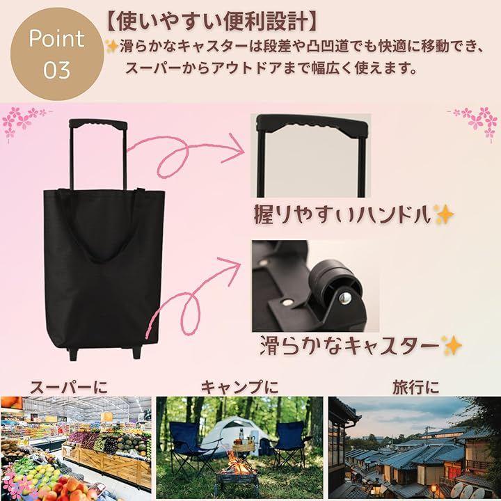 滑らかなキャスターは段差や凸凹道でも快適に移動でき、スーパーからアウトドアまで幅広く使えます。