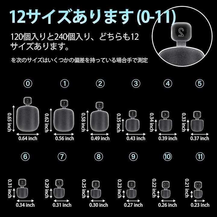 「足の爪に合う12サイズ」TOMICCAのつけ爪セットは12サイズ、合計120個で、最大サイズは長さ16.5mmと16.25mm幅で、ほとんどの人に適しています。