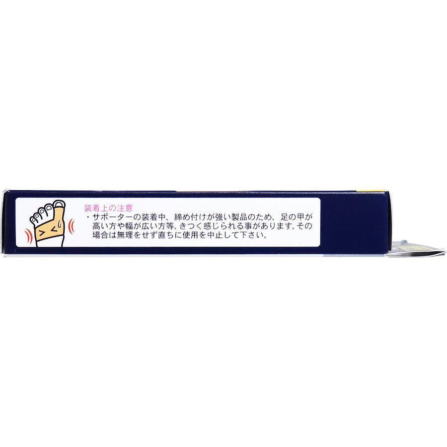 【注意】・外反母趾の保護固定用以外の用途で使用しないでください。・外傷、しっしん、かぶれ、アトピーのある方は使用しないでください。・万一、使用中に身体の異常を感じられた時には、直ちに使用を中止して下さい。・就寝時や安静時他、長時間の使用はお避け下さい。・サイズをよく確認のうえ、使用して下さい。(対応サイズの表記は平均的なサイズと考えて下さい。足指の長さや足の形状により装着しにくい場合があります。)・乳幼児の手の届かない所に保管してください。・火気に近づけないで下さい。