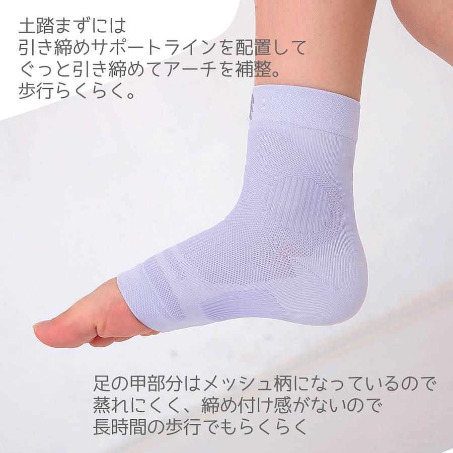 【商品情報】リハビリ施設と共同開発パッド状着圧ラインが添え手のように支えるサポーター足首をグッと支えてぐんぐん歩こう!くるぶし周りにパッド状着圧ラインを配置し側面から足首のブレを防ぎます。かかとを中心に、かかとホールドラインが足底から安定した歩行へ導きます。土踏まずには引き締めサポートラインを配置してぐっと引き締めてアーチを補整。歩行らくらく。足の甲部分はメッシュ柄になっているので、蒸れにくく、締め付け感がないので、長時間の歩行でもらくらく。