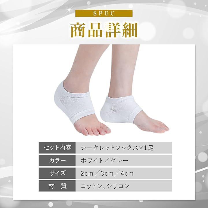 「商品詳細」セット内容:シークレットソックスx1足 カラー:ホワイト/グレー サイズ:2cm/3cm/4cm 材質:コットン、シリコン *モニターの環境により、色の見え方に若干差が生じる場合がございます。