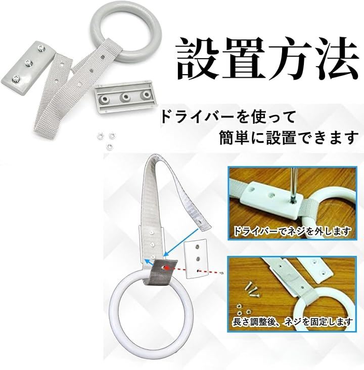 簡単設置で安心 プラスドライバーでネジを外し、ナイロン紐を通して再度固定するだけの簡単取り付け。