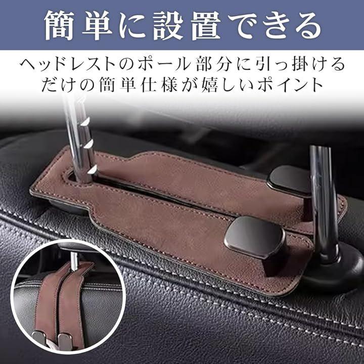 設置方法はヘッドレストの支柱に引っ掛けるだけ。工具や粘着剤などは一切使用しないため誰でも簡単に設置できるところが嬉しいポイントです。
