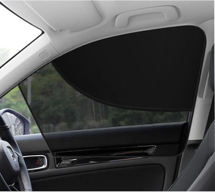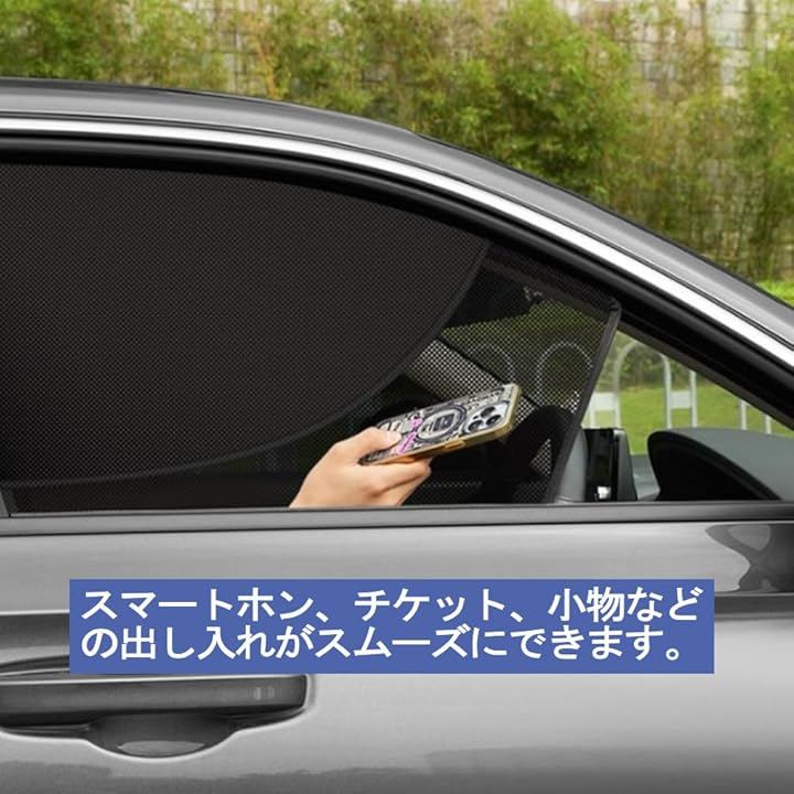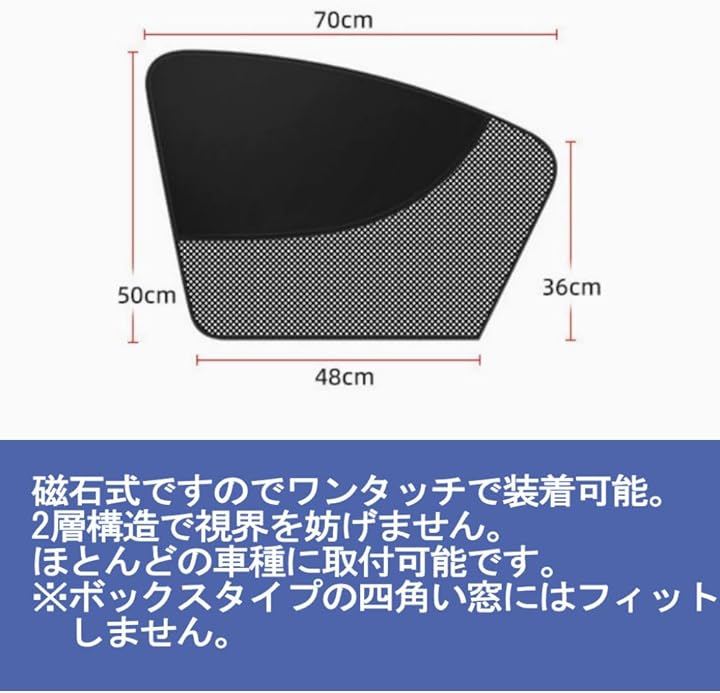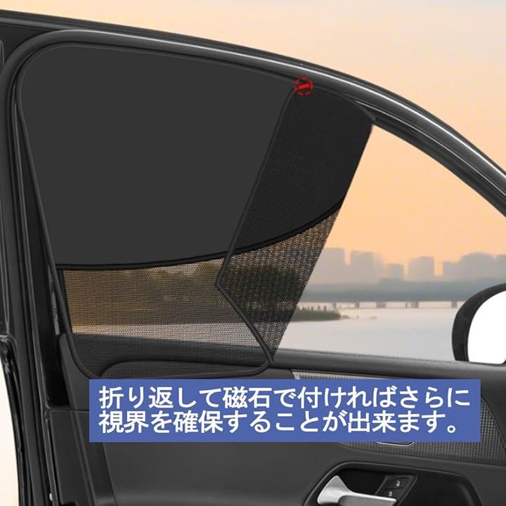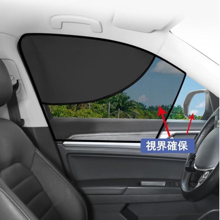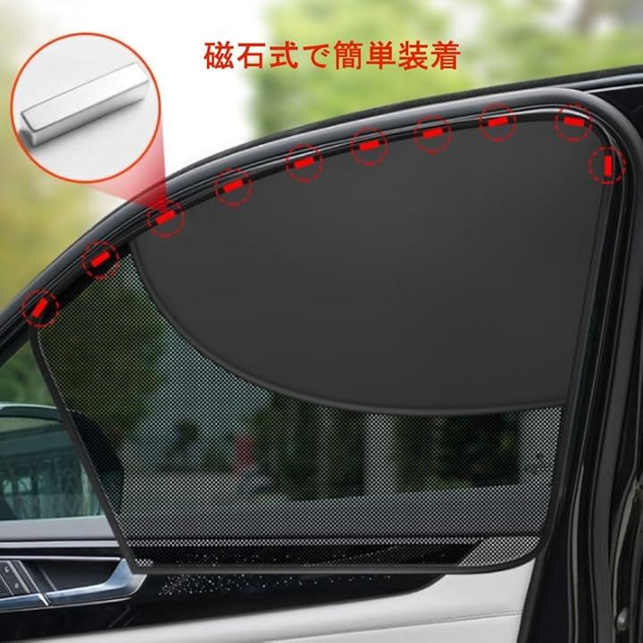 マグネット式で窓枠に簡単に取り付けでき、前席左右にフィットする2枚セットです。