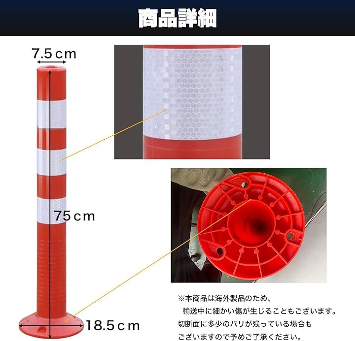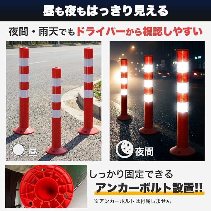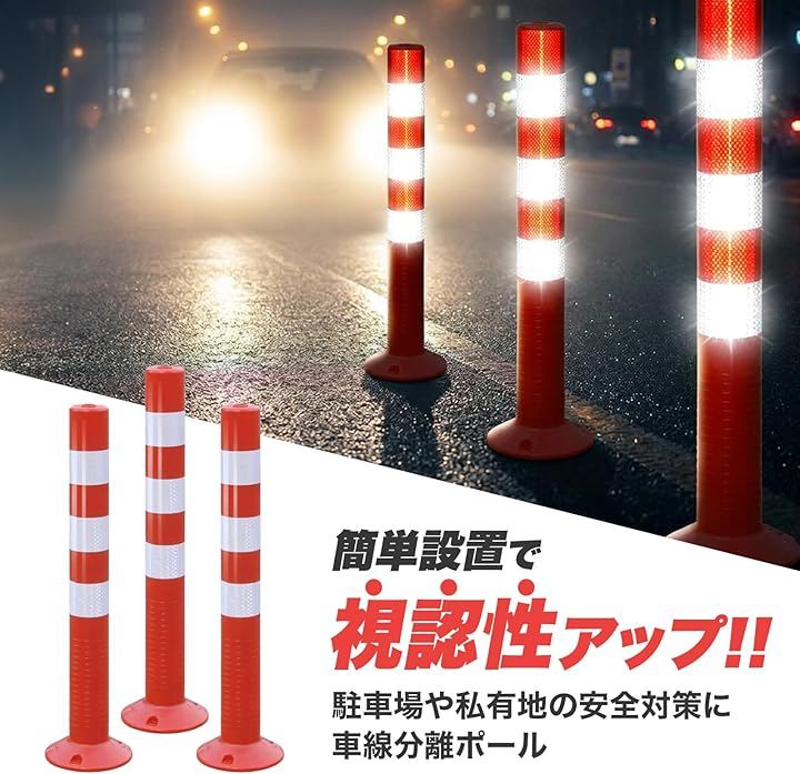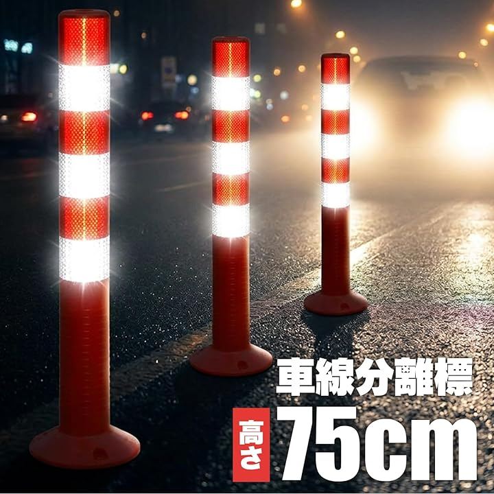 鮮やかな赤色ボディに反射テープ付きで、夜間や雨天時もはっきり確認でき、安全対策や接触防止に役立ちます。