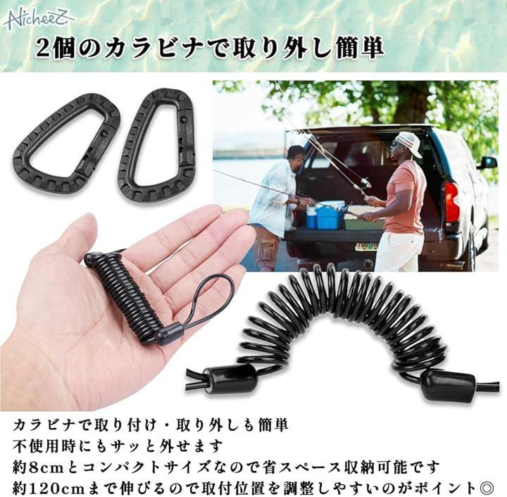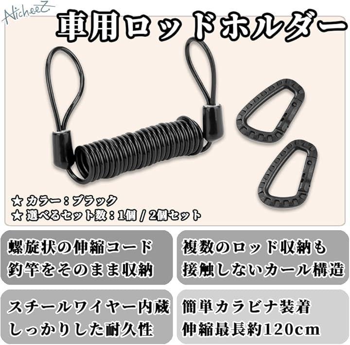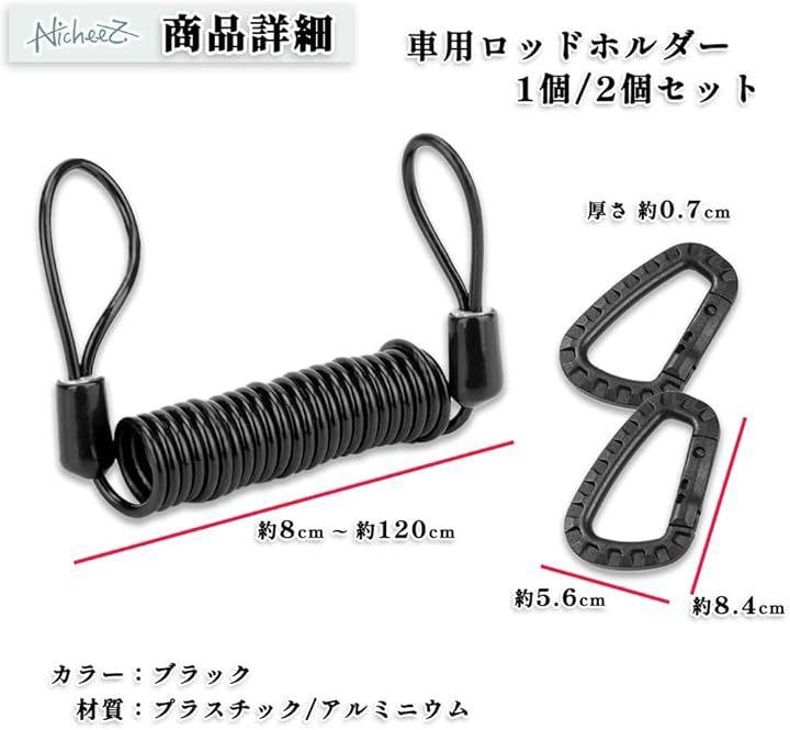 「商品内容」 車用ロッドホルダー1個/2個セット 材質:プラスチック/アルミニウム カラー:ブラック 本体サイズ:長さ/約8cm 伸長時の長さ/約120cm カラビナサイズ:縦/約8.4cm 横/約5.6cm 厚さ/約0.7cm