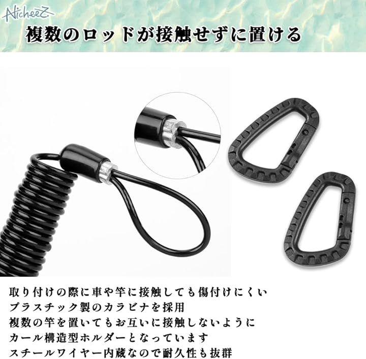 「複数のロッドが接触せずに置ける」取り付けの際に、車や竿に接触しても傷付けにくいプラスチック製のカラビナを採用。