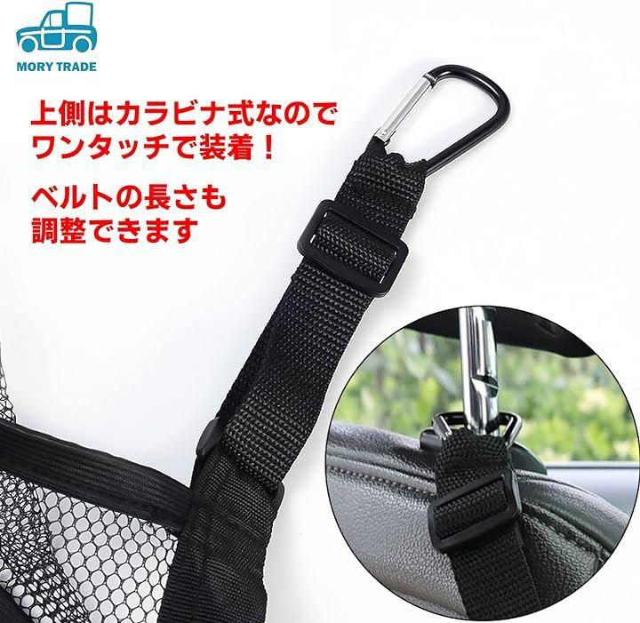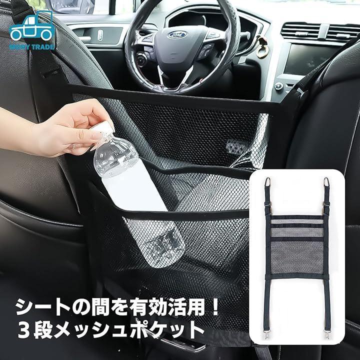 自動車の前席と後部座席の間に簡単に設置できる3段メッシュポケットは、車内の収納スペースを最大限に活用する便利なアイテムです。