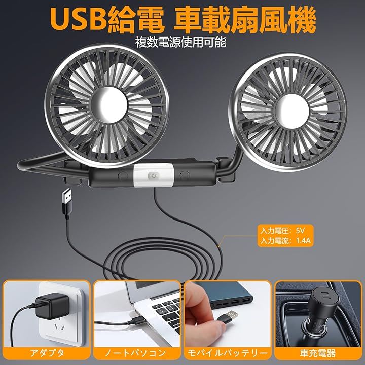 この車 扇風機はUSB給電式で、2つのファンが同時にパワフルな風を送り、車内の隅々まで爽やかな涼しさを届けます。
