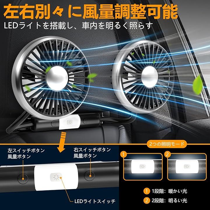 (1段階:暖かい光、2段階:明るい光)1つのファンでも2つ同時使用でも、LEDライト機能は問題なく使用でき、車内の雰囲気を高めます。