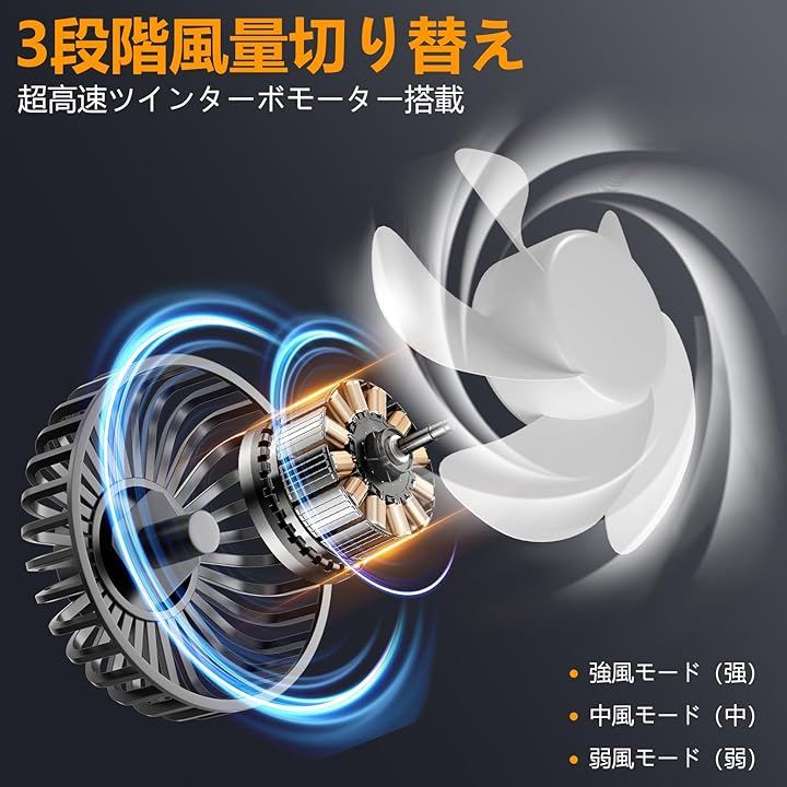 ブラシレスモーター技術により、静音性を保ちながらも強力な風を実現。